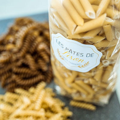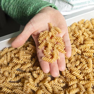 C’est avec cette farine et de l’eau que nous fabriquons nos pâtes fermières. Nous utilisons une presse et un moule en bronze pour mélanger ces deux ingrédients naturels. Ce mélange produit des pâtes qui vont alors sécher à basse température dans le séchoir pendant 19 heures, à la différence des pâtes industrielles qui sèchent à haute température dans un temps très court. Lorsque nos pâtes sont sèches, nous pouvons les mettre en paquet avec une ensacheuse ou les stocker dans des bacs pour la vente en vrac dans notre boutique.